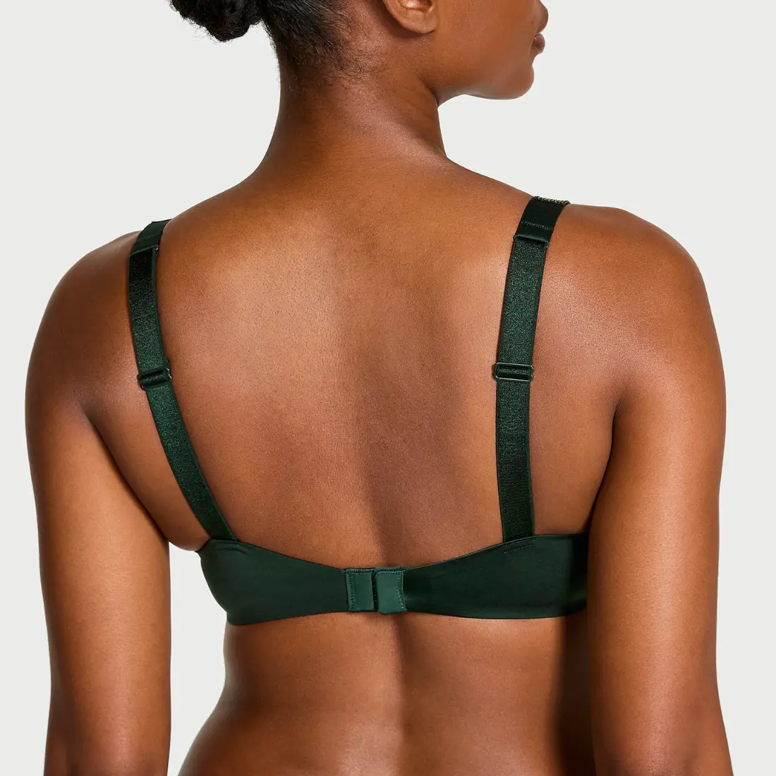 Головна особливість моделі — бретелі, прикрашені блискучими стразами у вигляді логотипу Victoria’s Secret. Глибокий колір “Кілантро” нагадує благородний смарагд і додає образу аристократичності. Спеціальне пуш-ап наповнення (Push-up padding) візуально додає один розмір чашки, створюючи спокусливе декольте, яке водночас виглядає максимально природно.