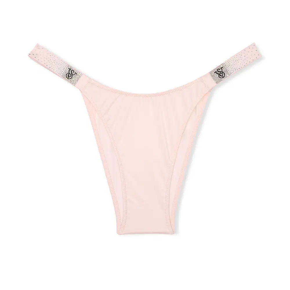 Ця сексуальна модель трусиків вражає оновленою версією фірмових сяючих бретелей – ніжним розсипом страз, елегантно доповнених фірмовим логотипом VS. Низька посадка та високий виріз на стегнах візуально подовжують ноги. Сяючі бретелі з розсипом страз та логотипом додають нотку розкоші та ніжності. Чарівний рожевий відтінок “ангельський рожевий” випромінює легкість та жіночність. Мінімальне покриття ззаду підкреслює спокусливість образу. Натуральна бавовняна ластка забезпечує комфорт протягом усього дня. Крім того, частина матеріалів виготовлена з переробленої сировини, що робить їх більш екологічним вибором.