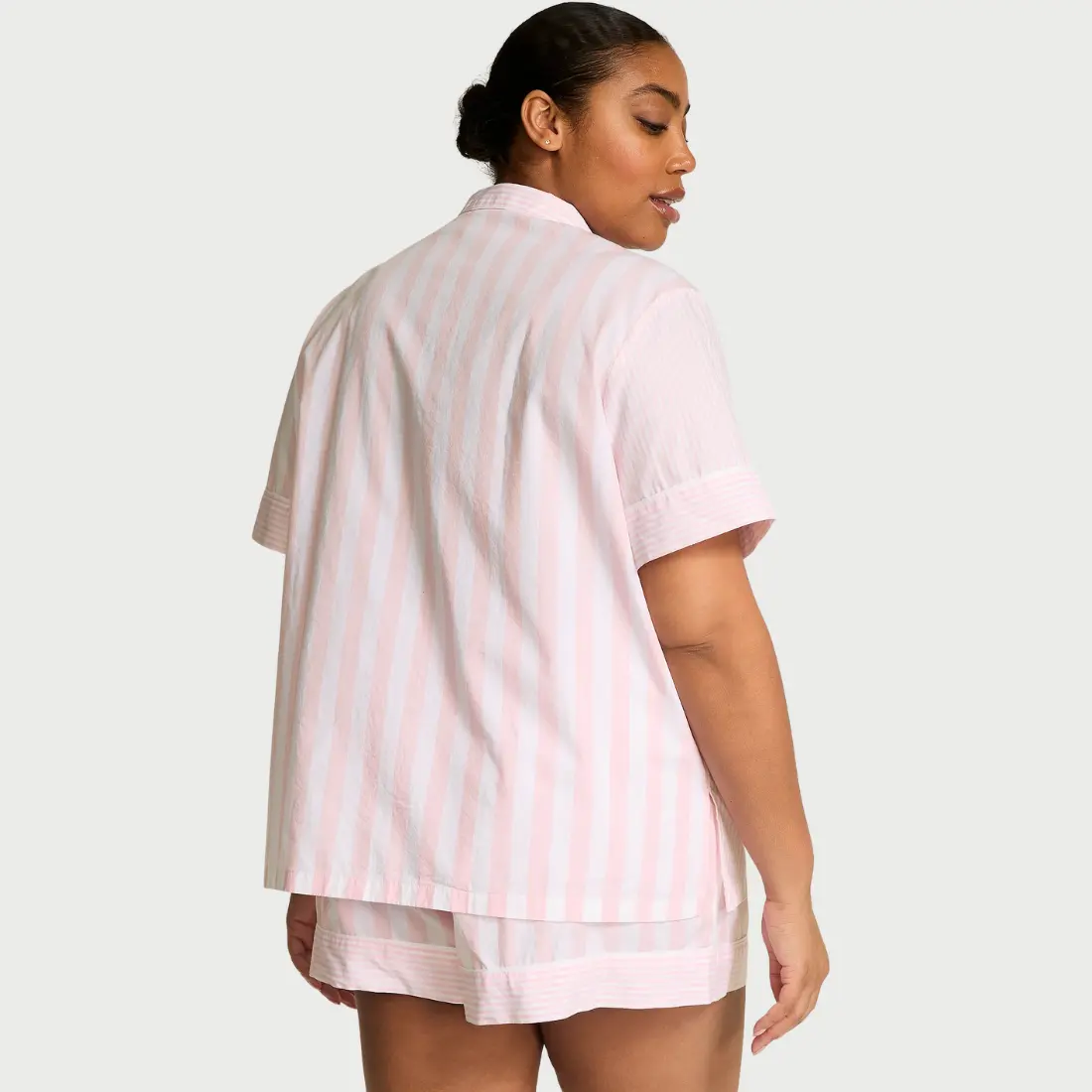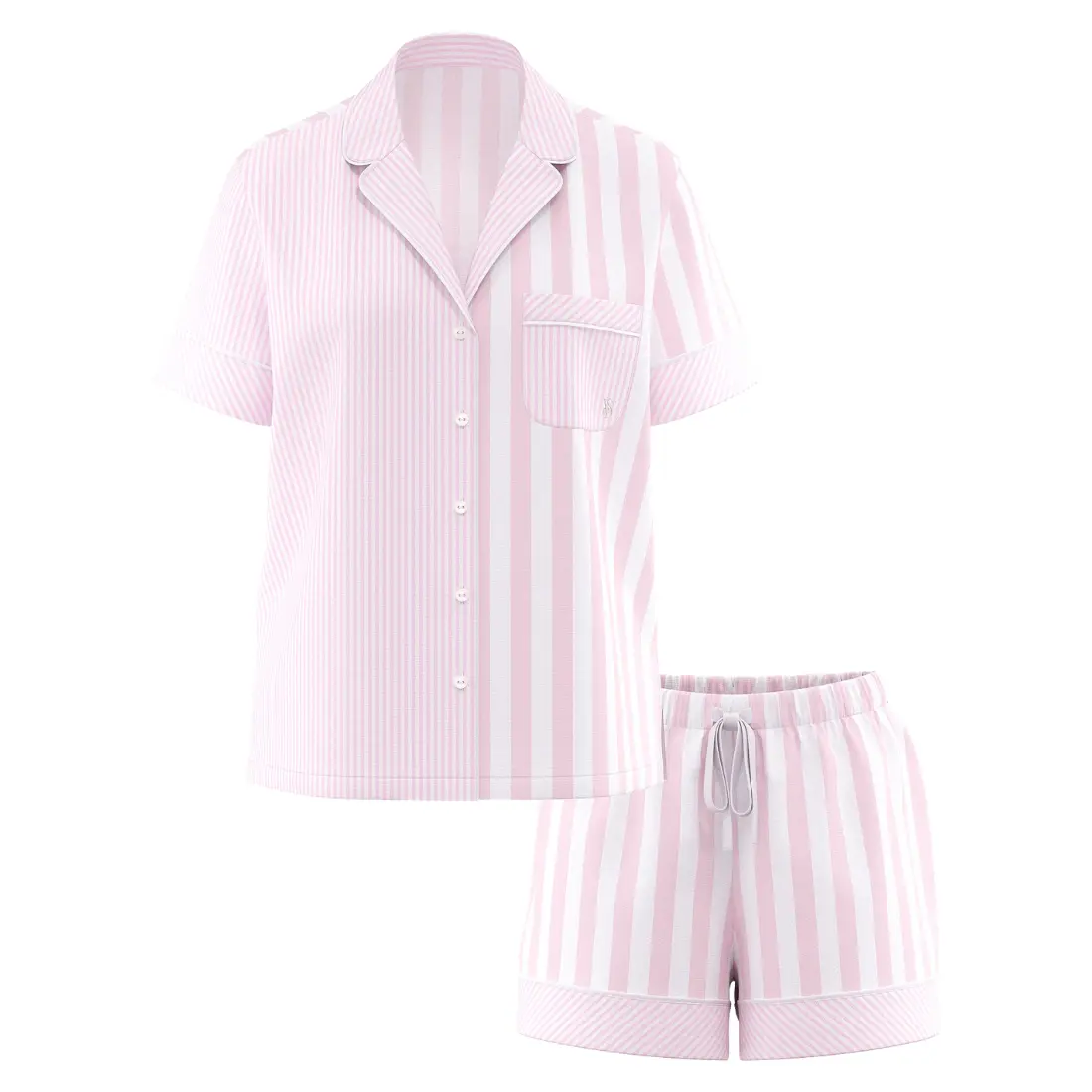 Контрастний кант додає елегантності, а фірмова вишивка з логотипом на кишеньці підкреслює стиль та унікальність бренду Victoria’s Secret. Верх піжами — класична сорочка з коротким рукавом та ґудзиками спереду — акуратно спадає нижче стегон, створюючи акуратний та невимушений силует. Зручні шорти з м’яким поясом на зав’язках чудово сідають на талії та забезпечують свободу рухів.
