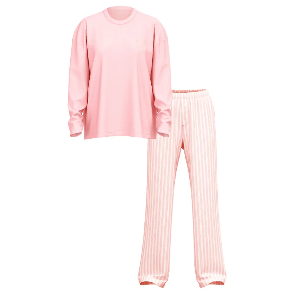 Ця розкішна піжама поєднує комфорт із елегантним дизайном. Верх виготовлений зі 100% бавовни, прикрашений блискучим логотипом із камінців, додаючи нотку розкоші до вашого домашнього стилю. Низ – це фланелеві штани зі зручною посадкою, виконані з надзвичайно м’якої бавовняно-модальної суміші.