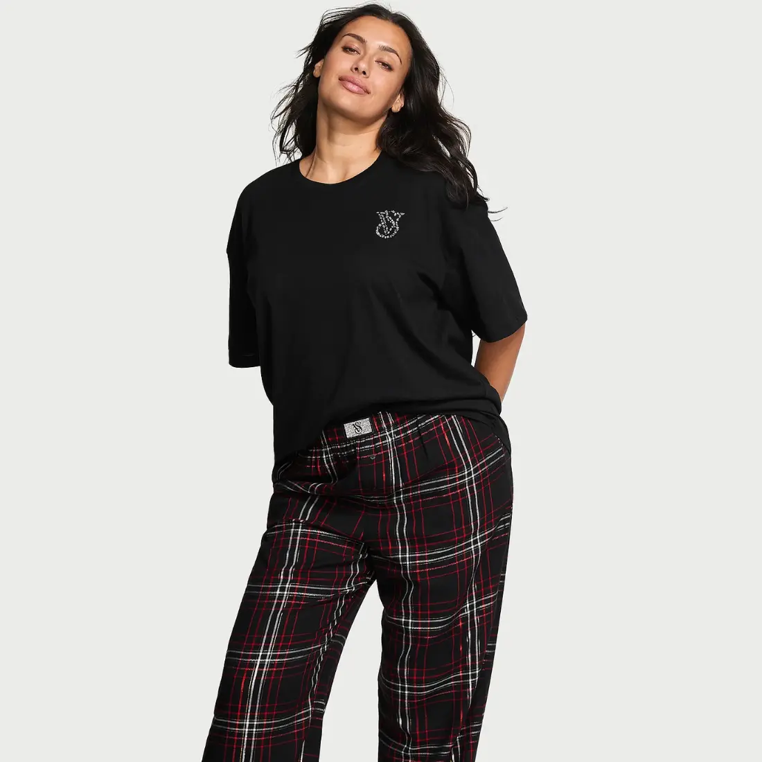 Ця піжама поєднує в собі лаконічність бавовняної футболки та розкіш фірмової фланелі в клітинку. Особливого шарму додає мерехтлива нашивка зі стразами, яка прикрашає пояс штанів. Це ідеальний вибір для тих, хто цінує комфорт, але не готовий відмовлятися від стильного “bling” ефекту.