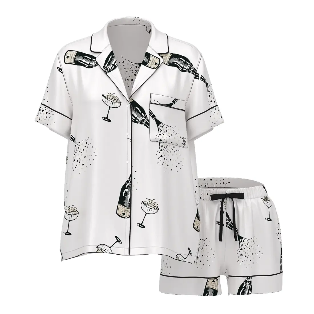 Ця піжама створена для особливих моментів та ігристого настрою. Елегантний принт із пляшками шампанського на сяючому сатині робить цей набір ідеальним вибором для дівич-вечорів, святкових ранків або просто для того, щоб відчути себе особливою вдома.