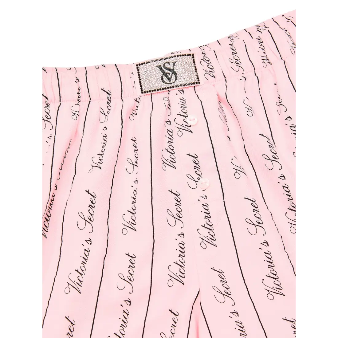 Шорти виготовлені з фірмової м’якої фланелі та прикрашені принтом у вигляді каліграфічних написів “Victoria’s Secret”. На еластичному поясі розташований впізнаваний Shine Patch — фірмова нашивка, густо всипана кристалами, що мерехтять при кожному русі. Це оригінальна продукція, де кожна деталь продумана для вашого задоволення.