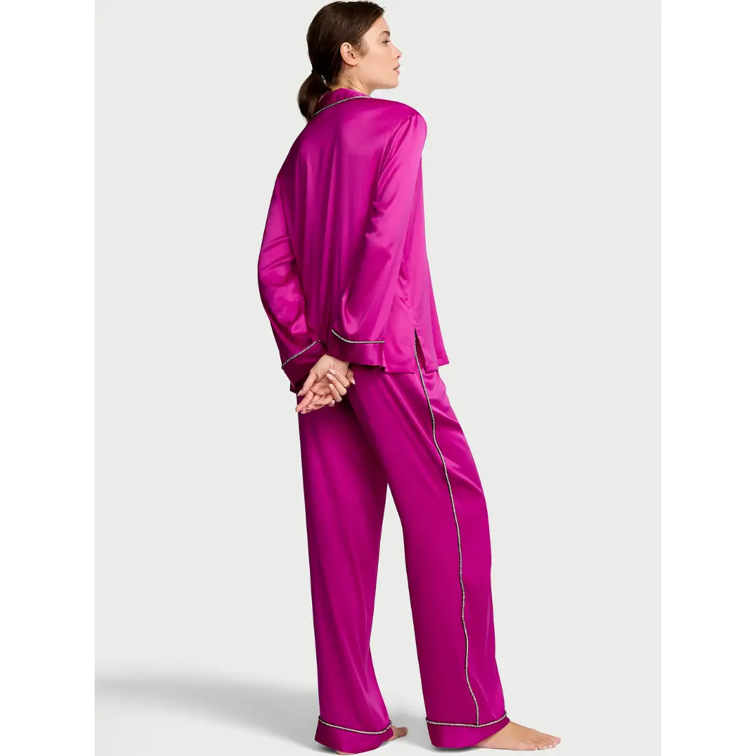 Головною особливістю цієї моделі є кант із блискучих кристалів (diamanté), який обрамляє комір, кишеню, манжети та бічні шви штанів. Кожен рух супроводжується делікатним мерехтінням, що робить ваш образ по-справжньому королівським. Це оригінальна продукція бренду, створена з глянцевого, приємного на дотик сатину, який дарує шкірі відчуття ніжності та прохолоди.