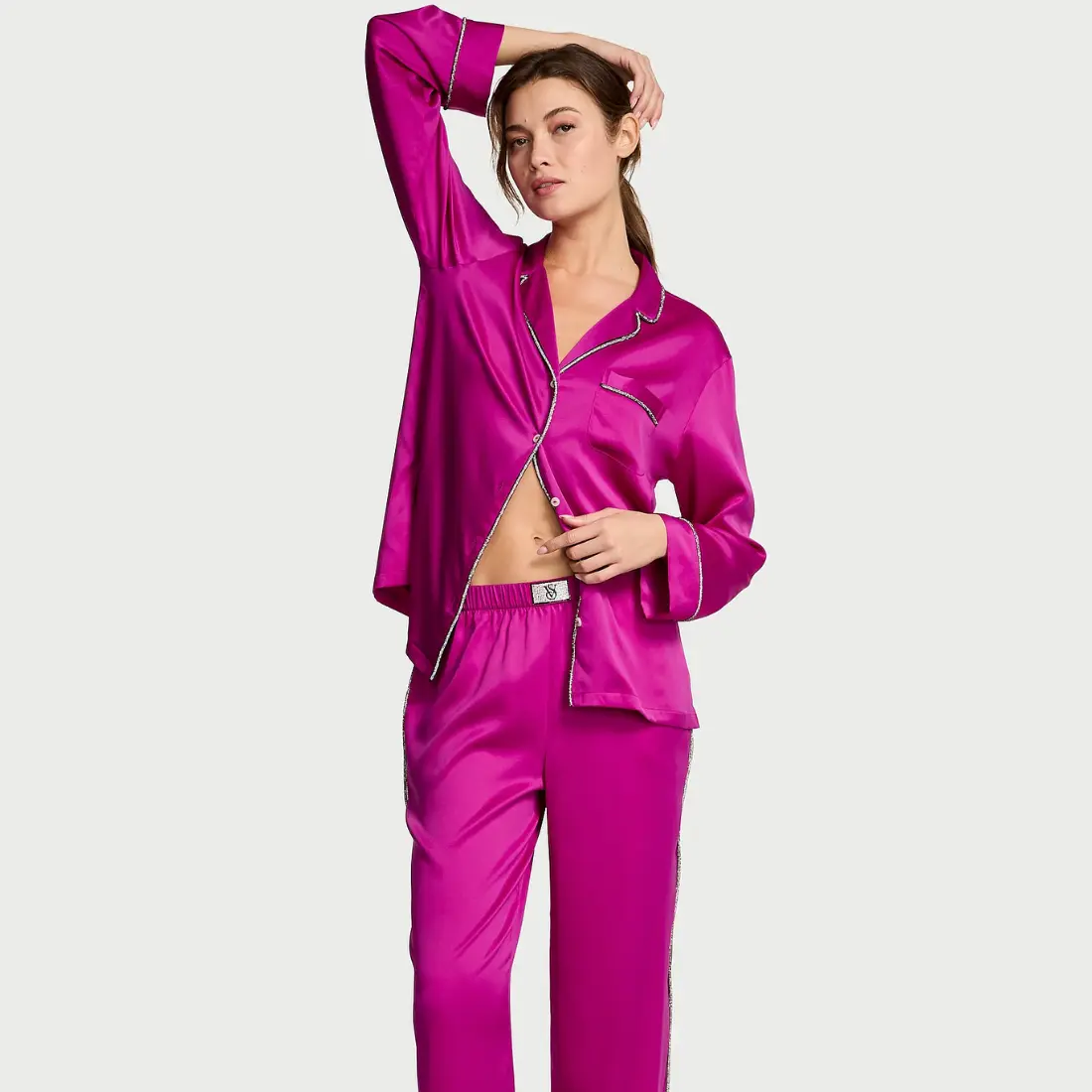 Сатинова піжама Victoria’s Secret Signature Shine Purple штани та сорочка з довгим рукавом