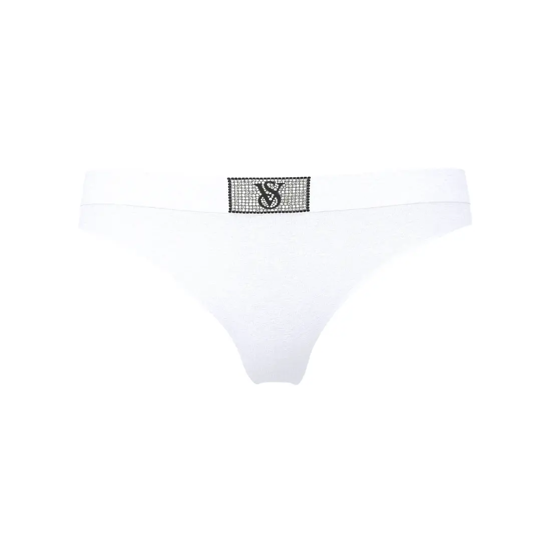 Головною окрасою моделі є фірмовий патч на поясі, густо інкрустований стразами. На білосніжному фоні блискучий логотип виглядає особливо вишукано та святково. Крій Thong із низькою посадкою та мінімальним покриттям ззаду забезпечує повну свободу рухів та непомітність навіть під світлим або облягаючим одягом.