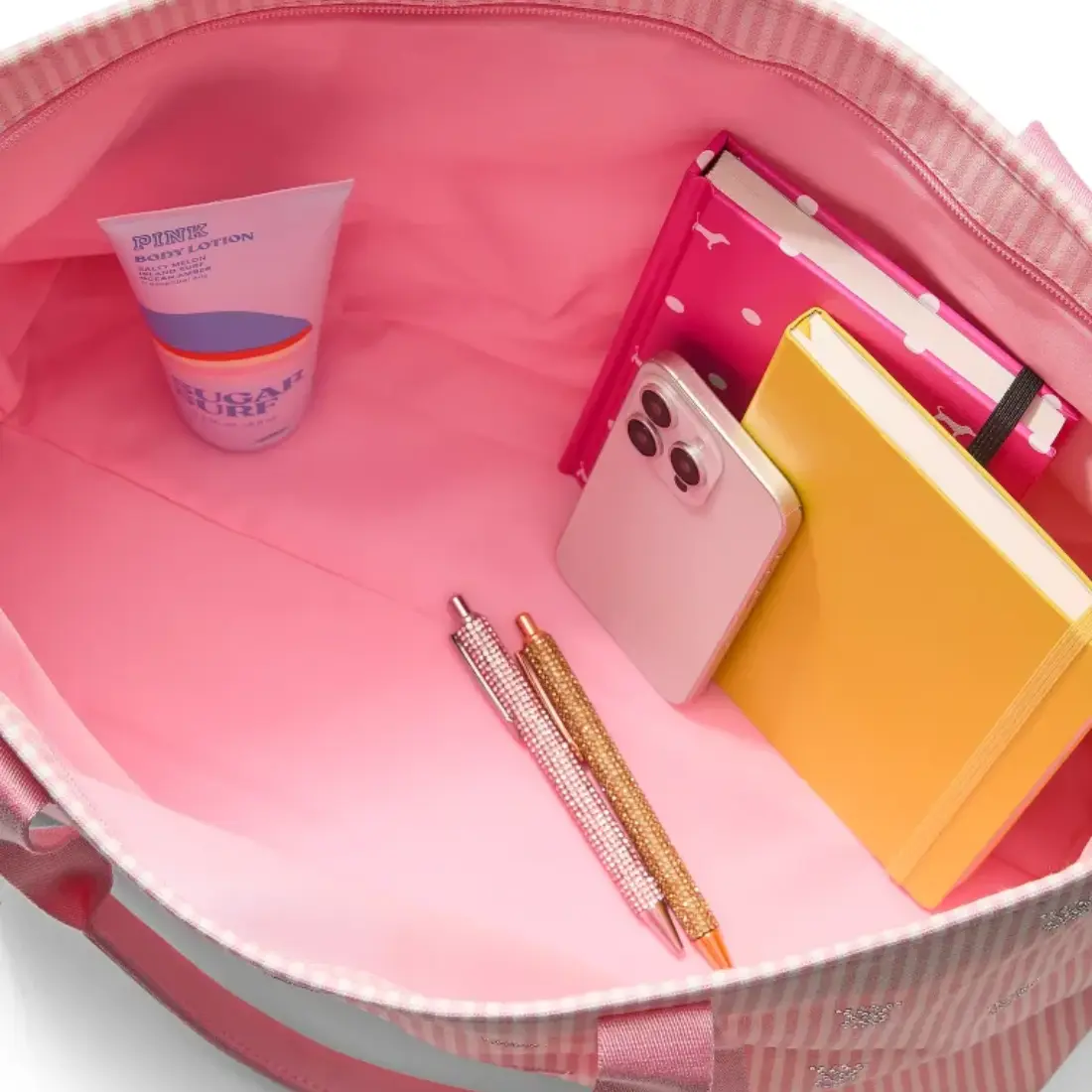 Ця сумка від Вікторії Сікрет вражає своїми значними розмірами, дозволяючи вмістити абсолютно все — від великого ноутбука та спортивної форми до покупок чи необхідних речей для подорожі. Незважаючи на габарити, сумка зберігає витончений вигляд завдяки вертикальним смугам. Надійність і зручність перенесення гарантують посилені ручки, розроблені для комфортного носіння навіть при повному завантаженні, що робить її ідеальною для використання у режимі 24/7.